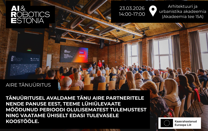 Tehisintellekti- ja robootikakeskus AIRE toetab Eesti tööstusettevõtteid nutikate digilahenduste kasutusele võtmisel tehisintellekti ja robootika vallas. AIRE-st saad nii teadmisi, kontakte kui ka infot rahastusallikate kohta.